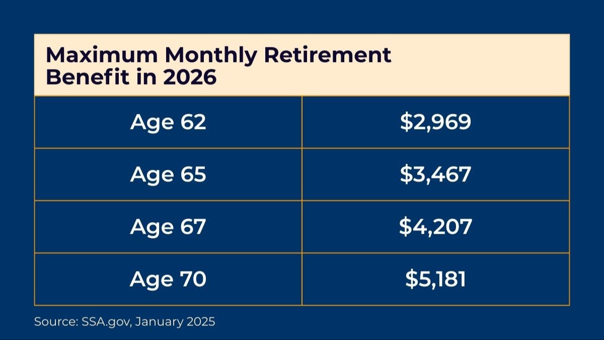 The maximum monthly benefit for a worker retiring at full retirement age (67) is $4,152 in 2026. If you delay Social Security beyond retirement age, you can receive monthly benefits of $5,181 for 2026. You can begin claiming Social Security benefits as early as age 62, but monthly payments will be reduced for each month they're received before you reach full retirement age.2